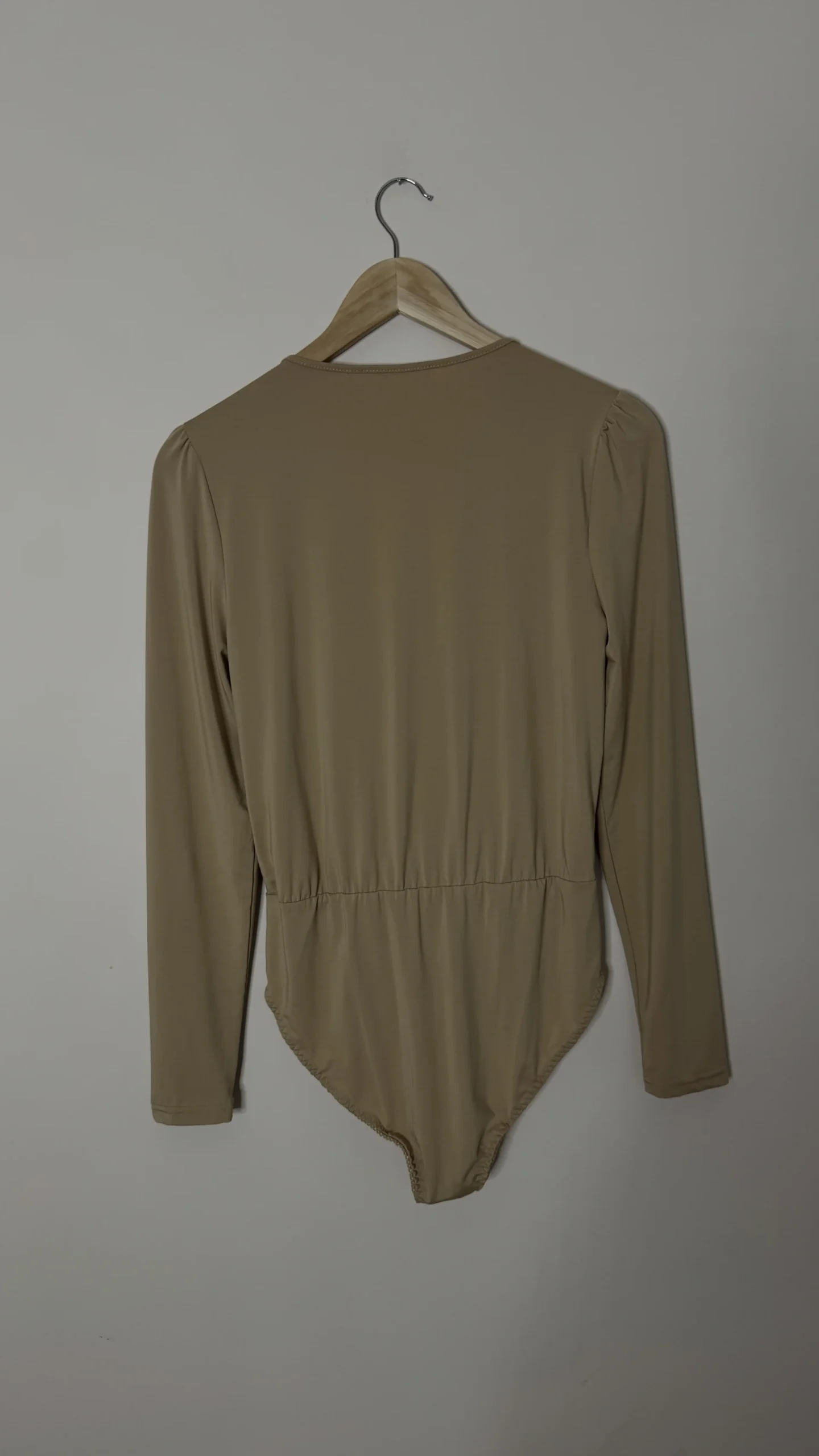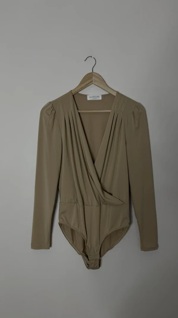 - Стиль: Боді з запахом (wrap-over/draped bodysuit) та довгими рукавами