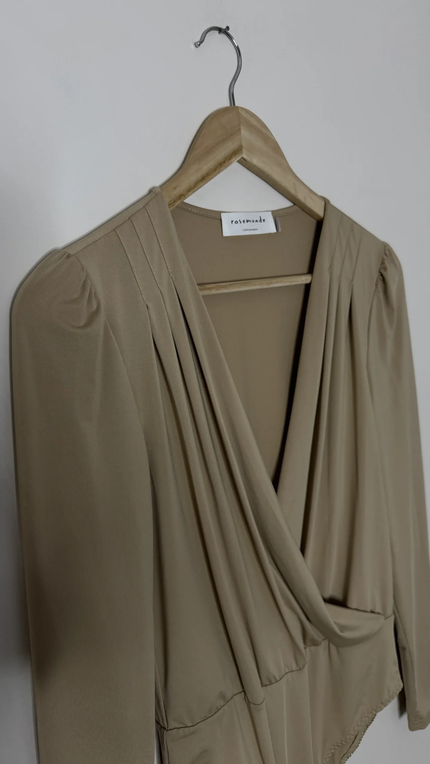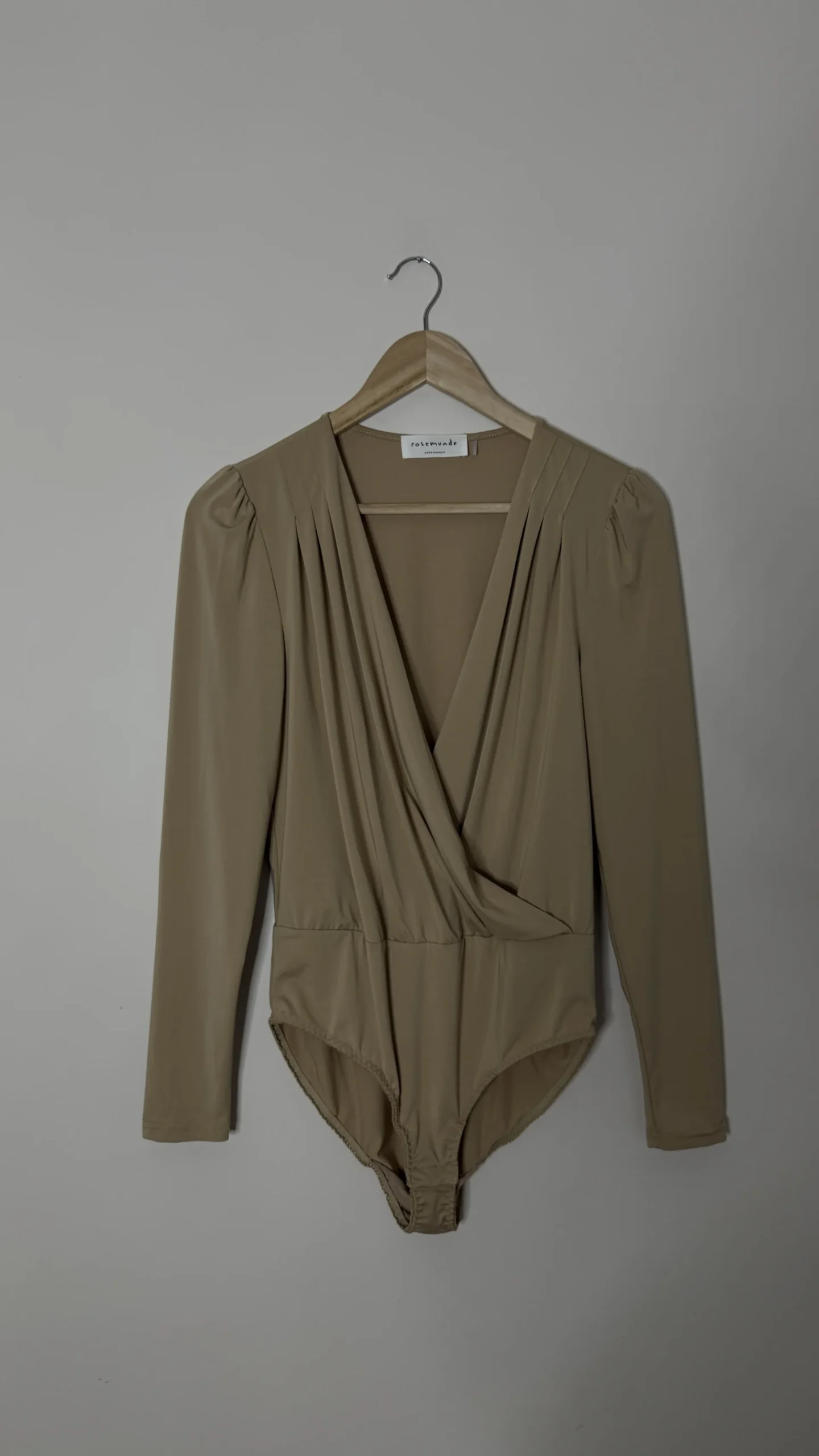 Бежевий боді з драпіруванням та довгими рукавами бренду Rosemunde.