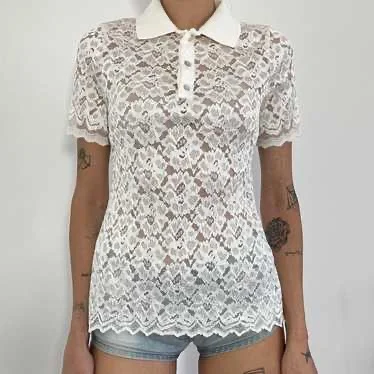 Біла мереживна сорочка-поло Italian Riviera від бренду Intimissimi. Вона виготовлена з м’якого еластичного мережива з ефектом в’язки гачком і має прозорий вигляд.