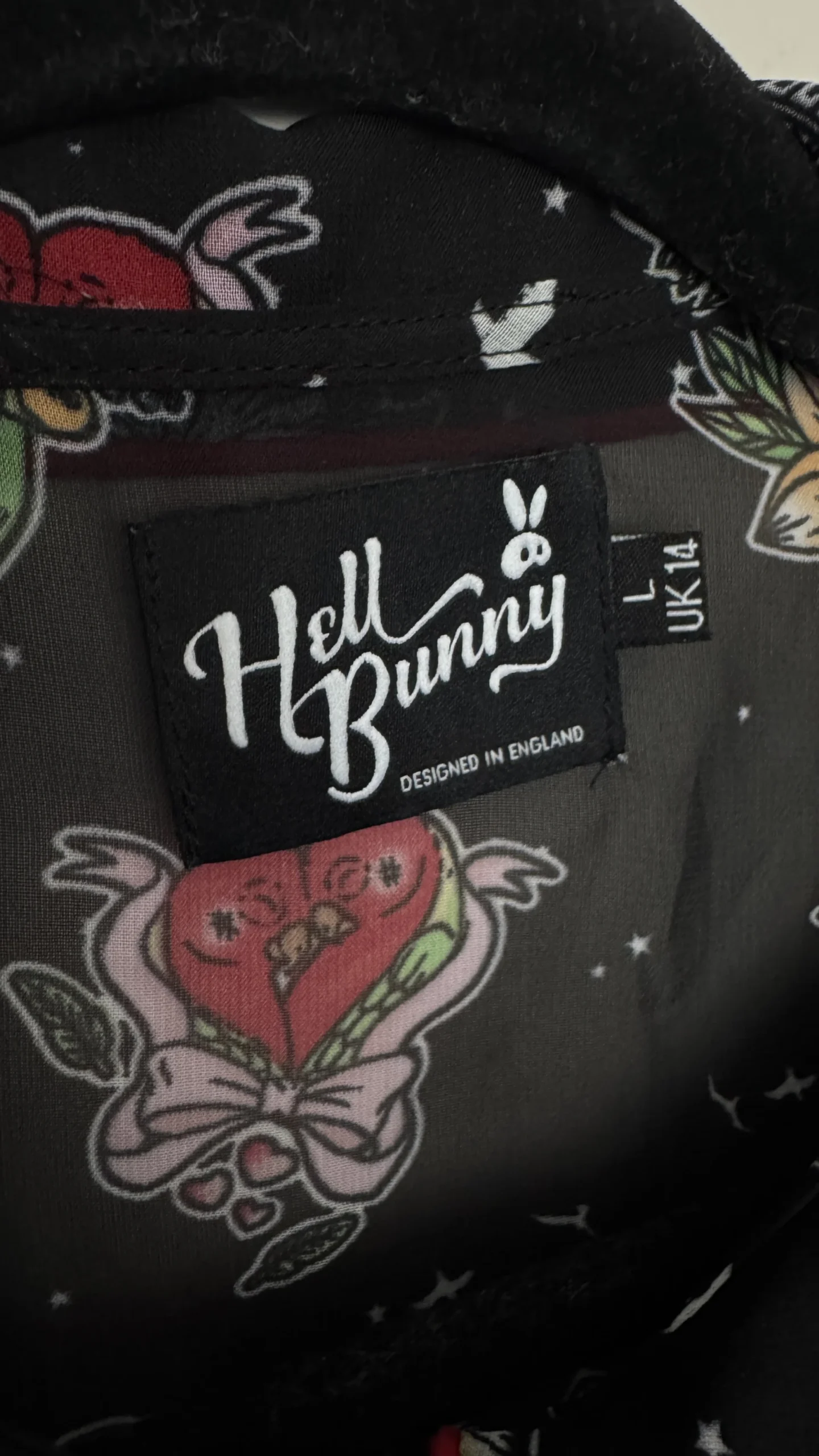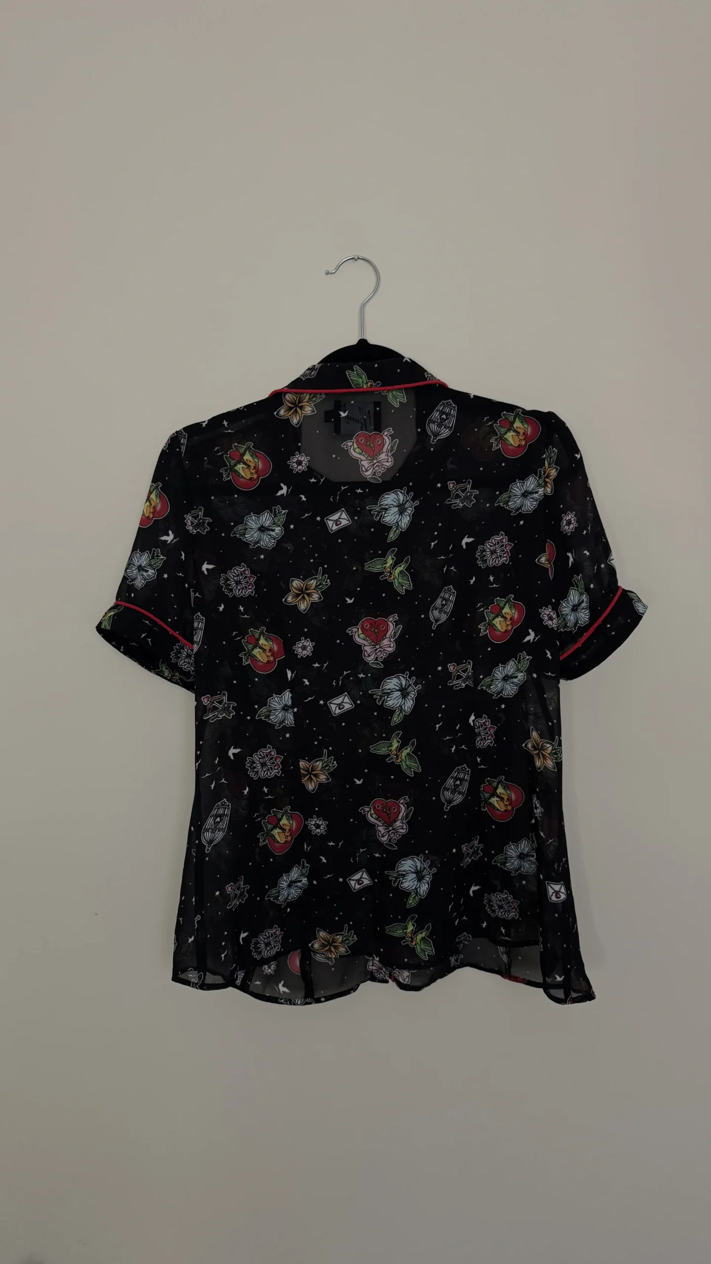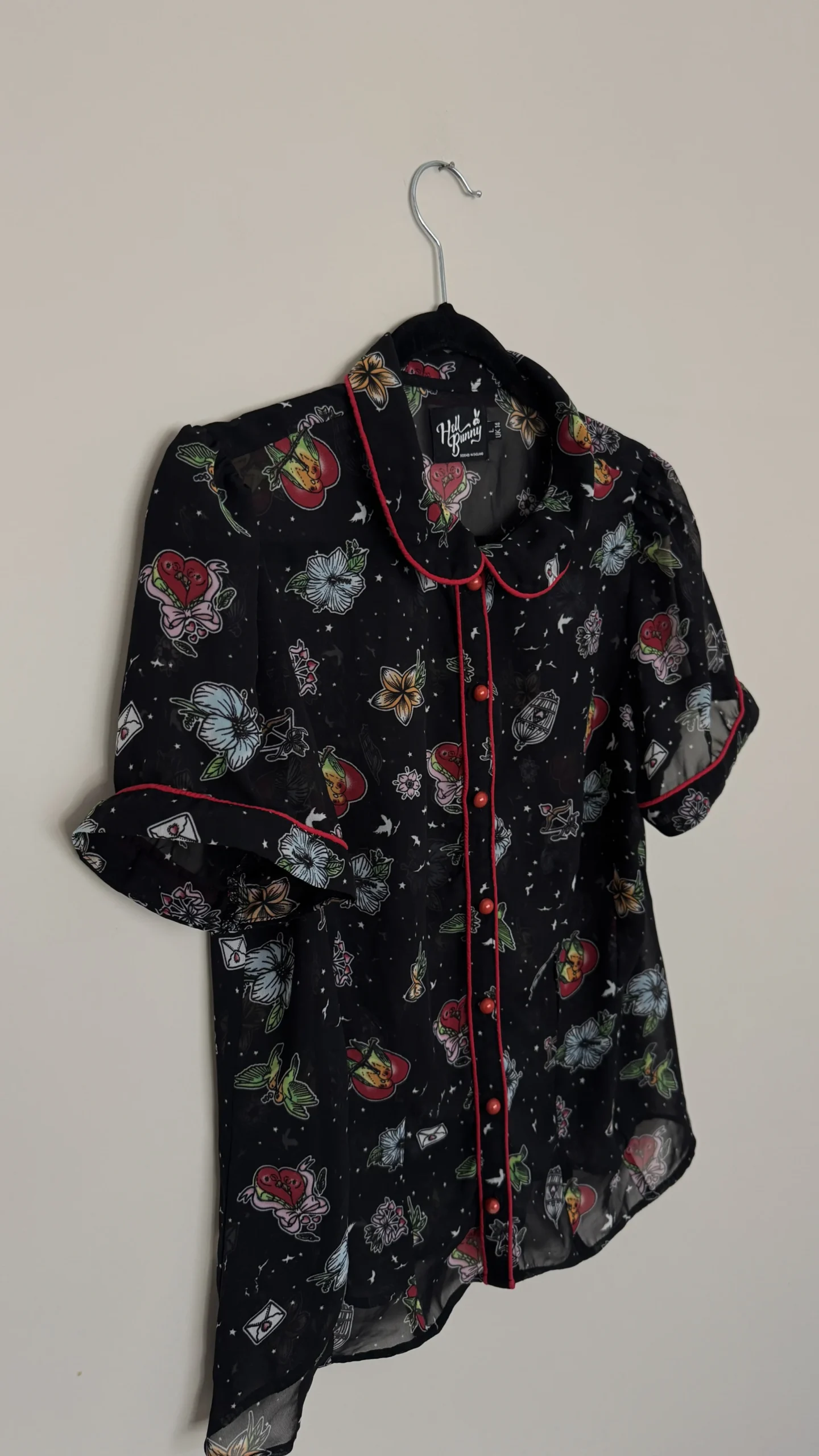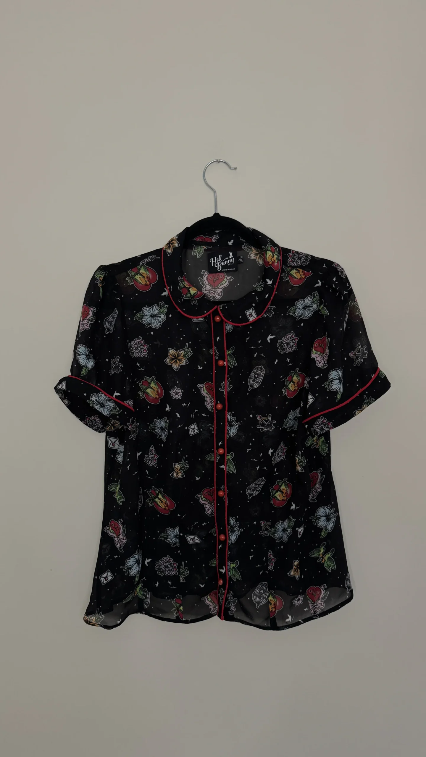 Чорна напівпрозора блузка-сорочка від бренду Hell Bunny з візерунком у стилі олдскульних татуювань. Вона має комір Пітера Пена та червону окантовку по краях коміра, ґудзикової планки та рукавів. Візерунок включає такі елементи, як кинджали, змії, серця, метелики та квіти.
