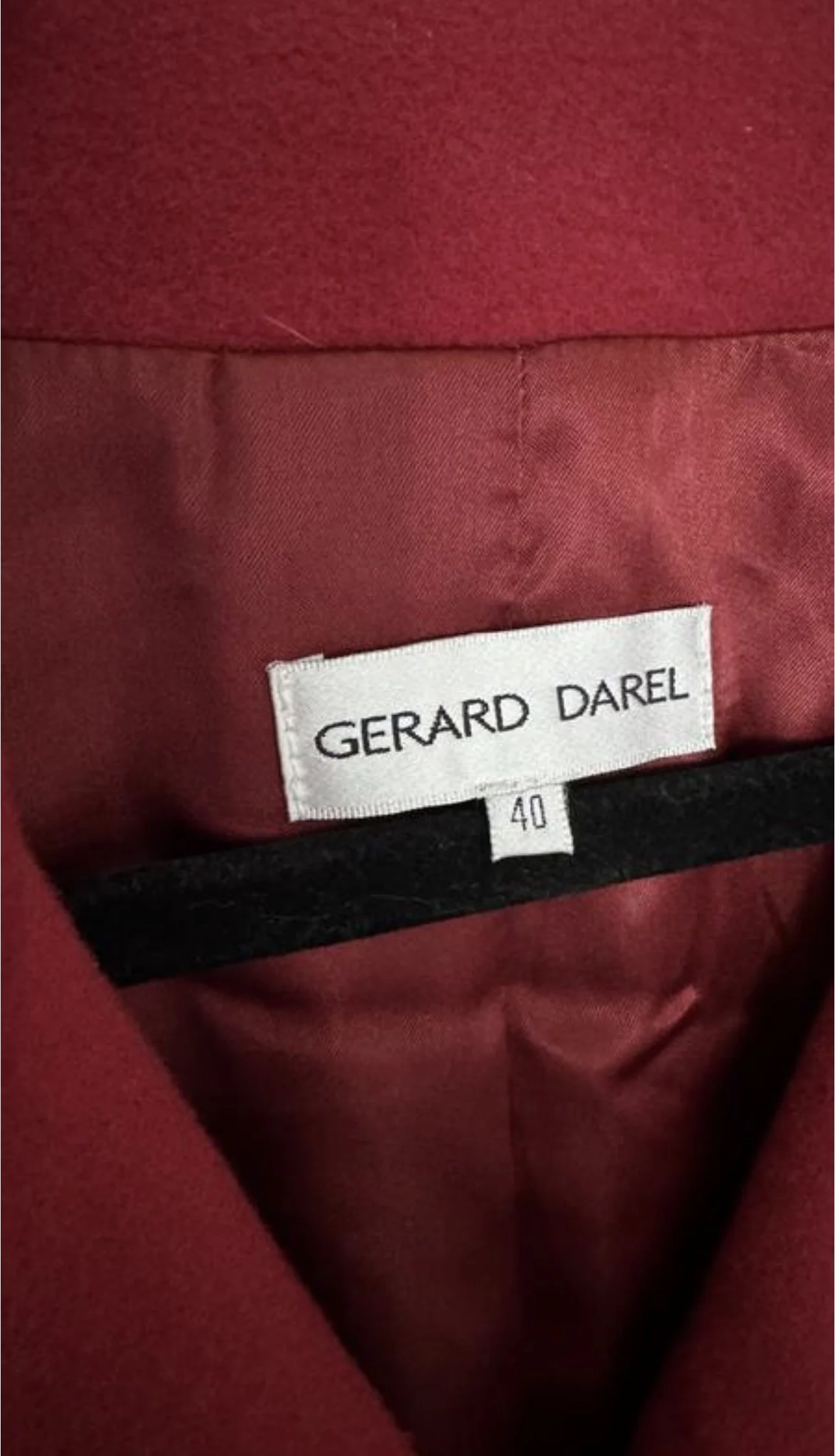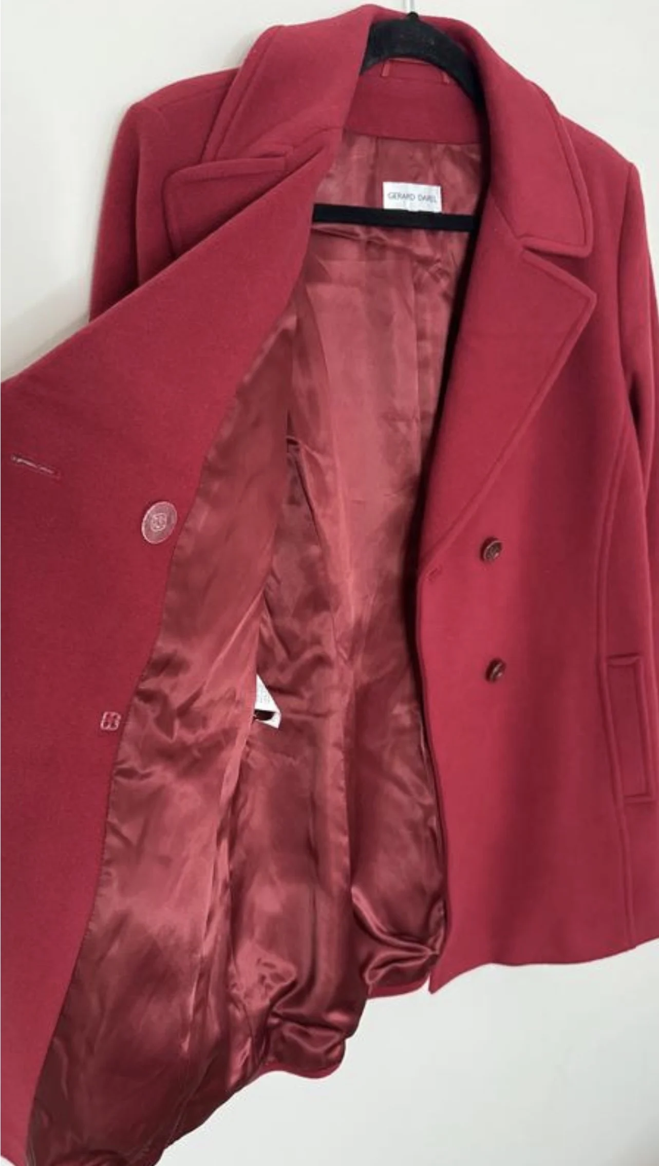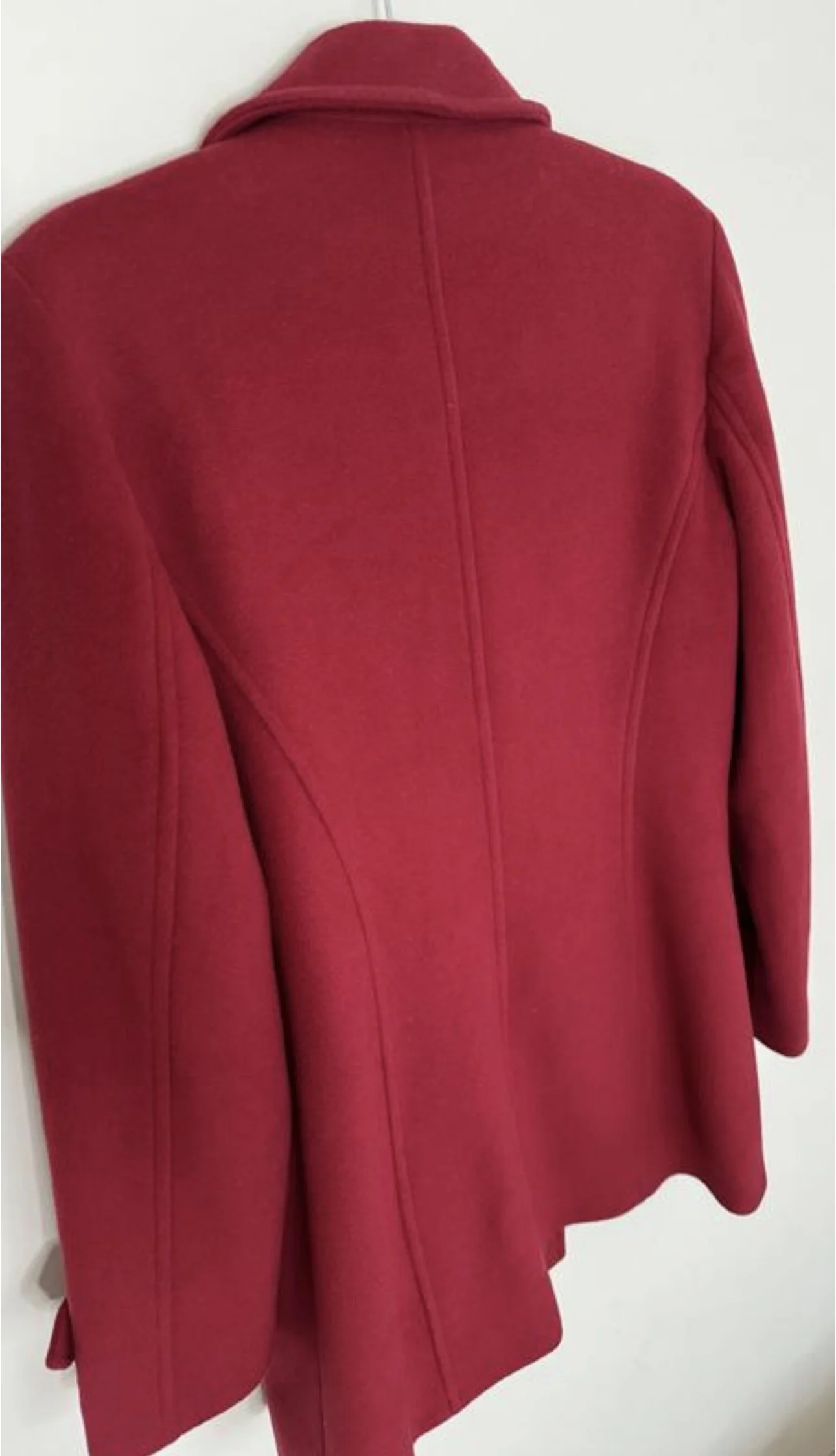 Червоне двобортне напівпальто (peacoat), виготовлене із суміші вовни та кашеміру, що забезпечує тепло та класичний, структурований вигляд. Воно має широкі лацкани, передню застібку на ґудзиках та манжети з хлястиками.
