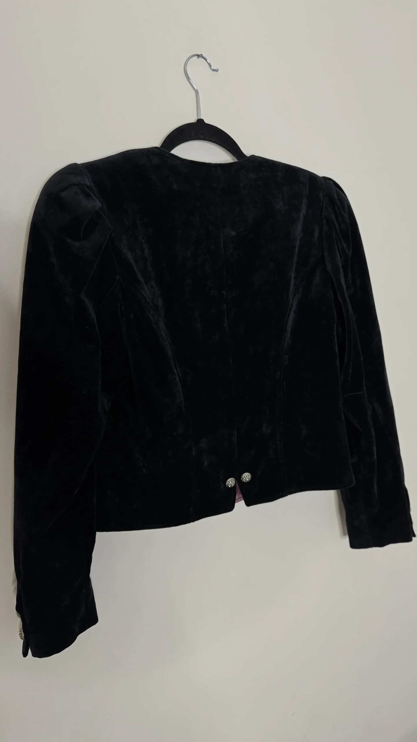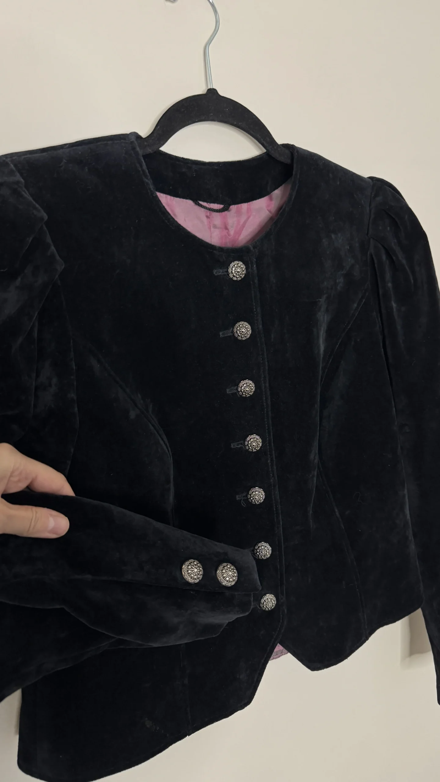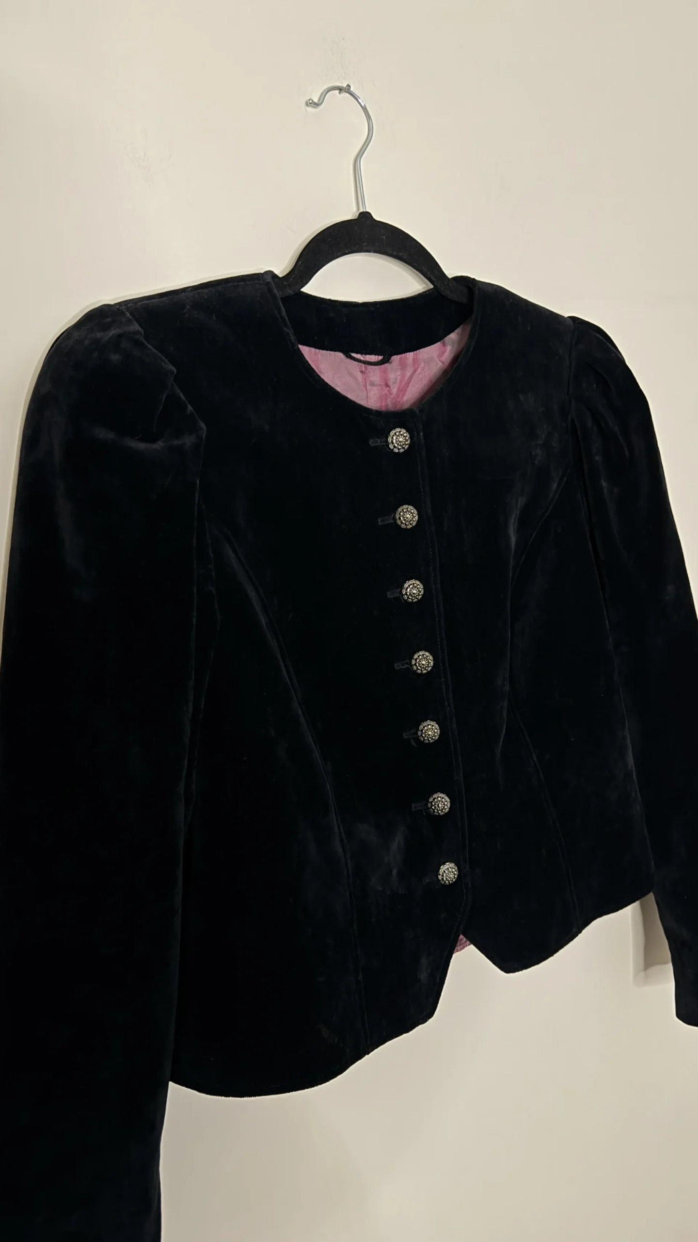 Чорний оксамитовий жакет з пишними рукавами та сріблястими ґудзиками.