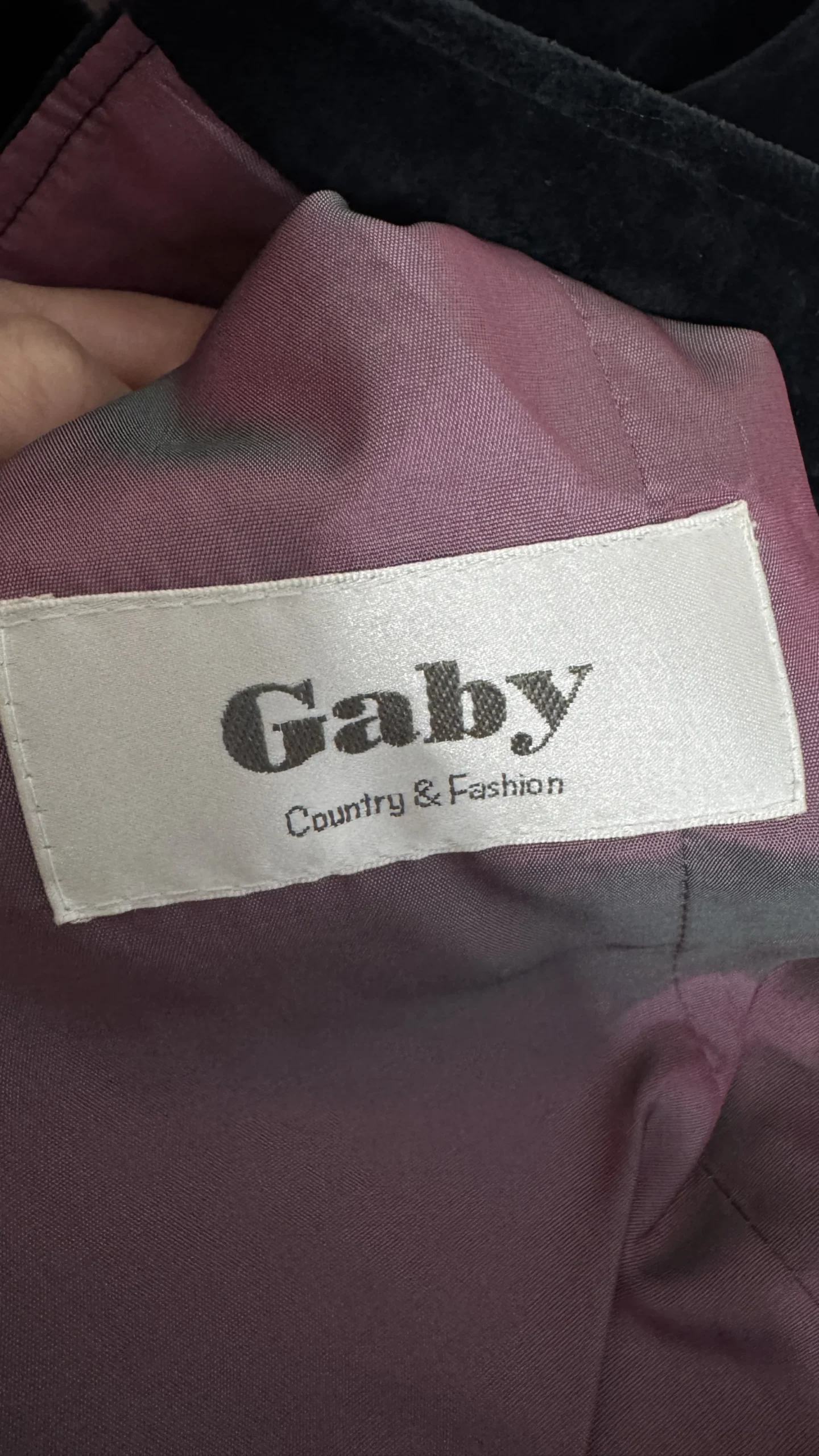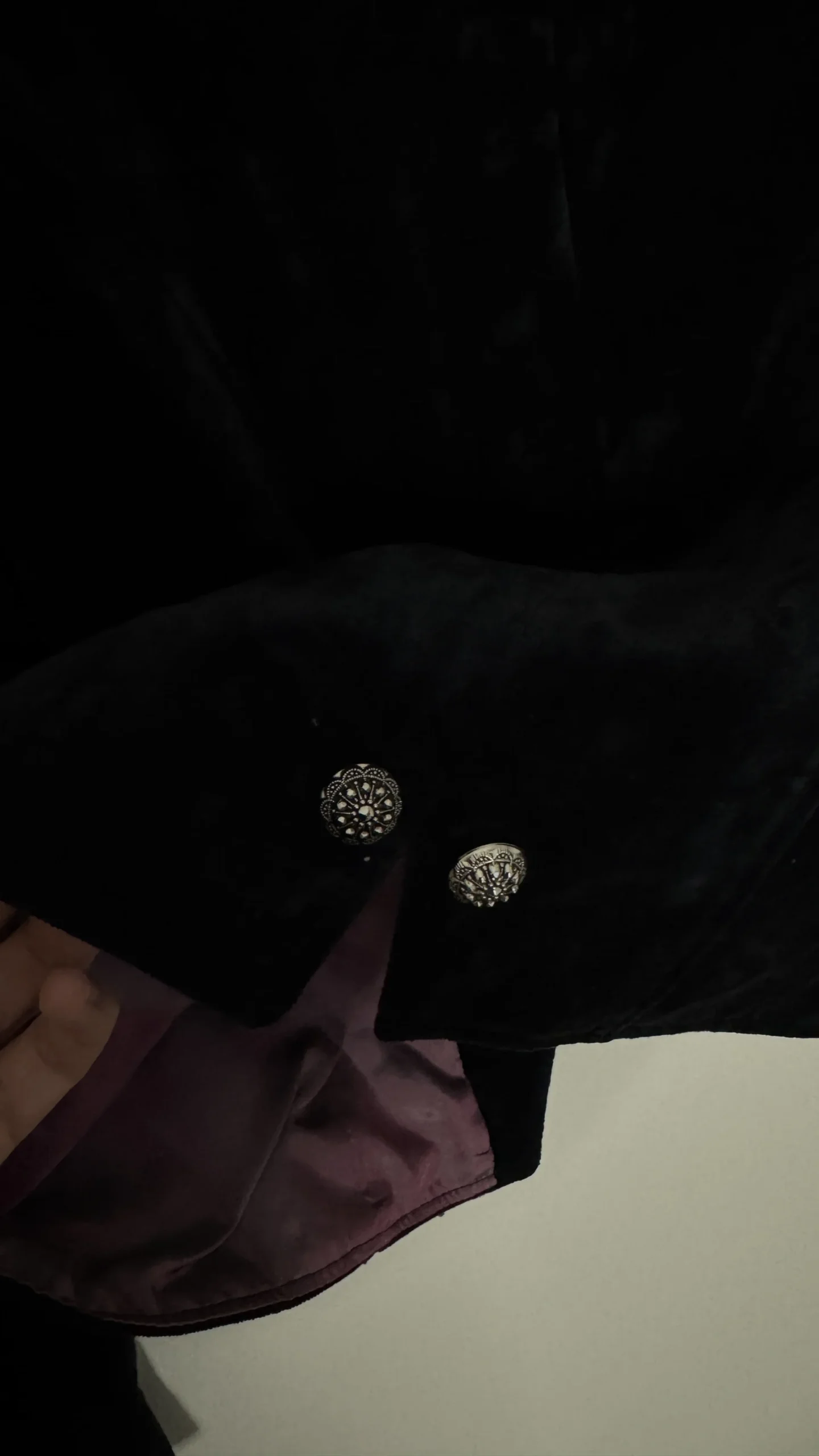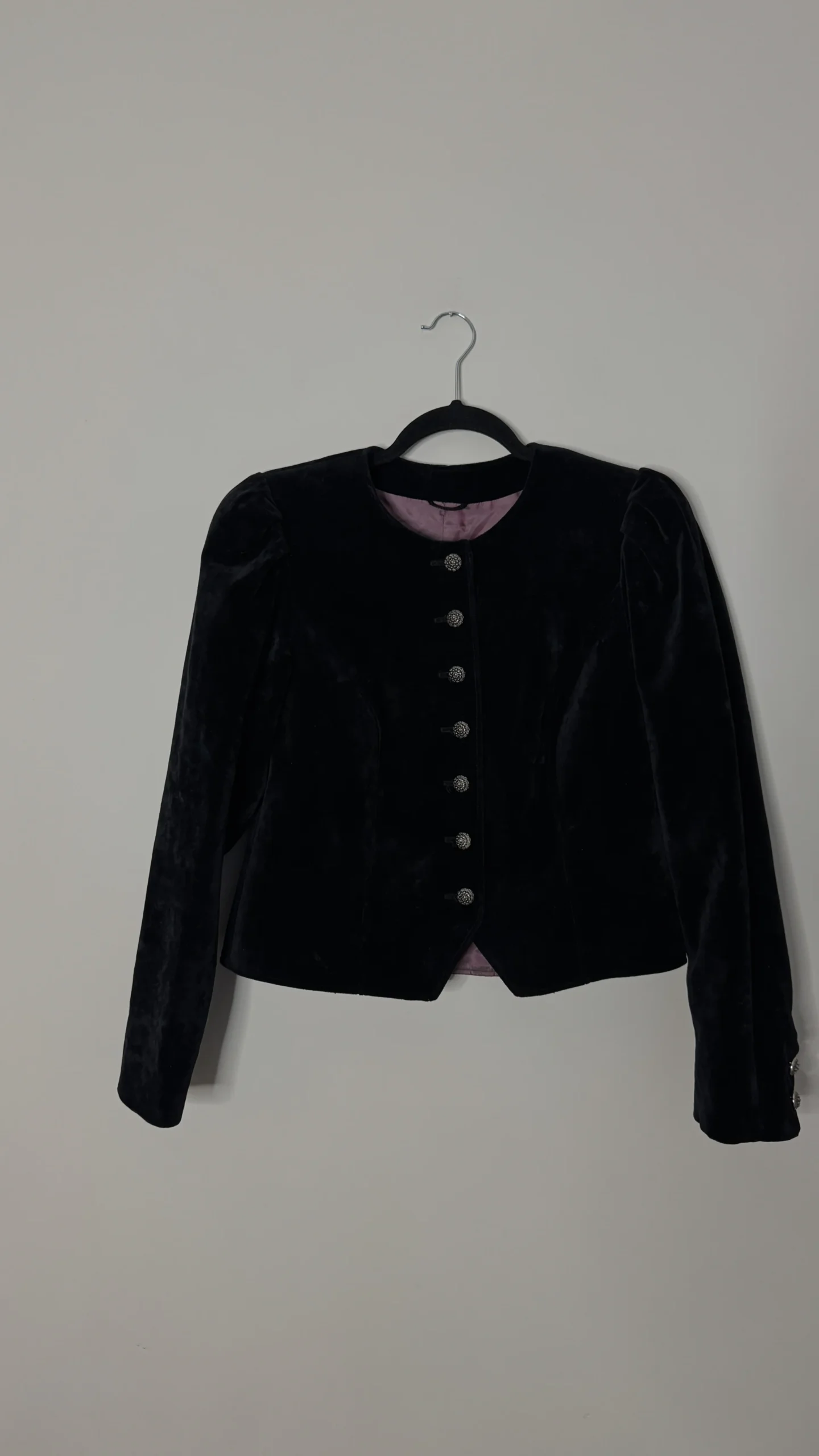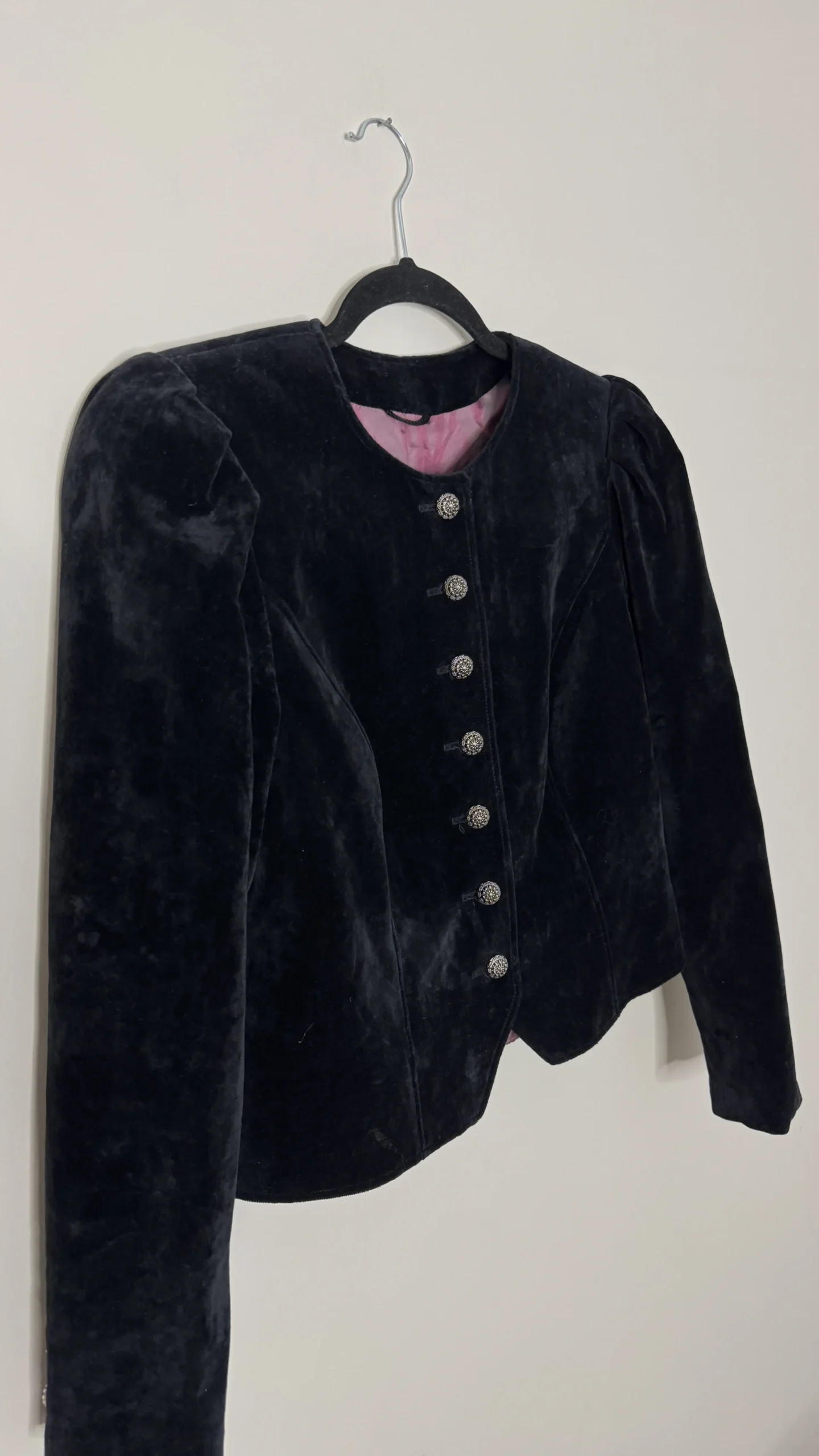 Чорний оксамитовий жакет з пишними рукавами та сріблястими ґудзиками.