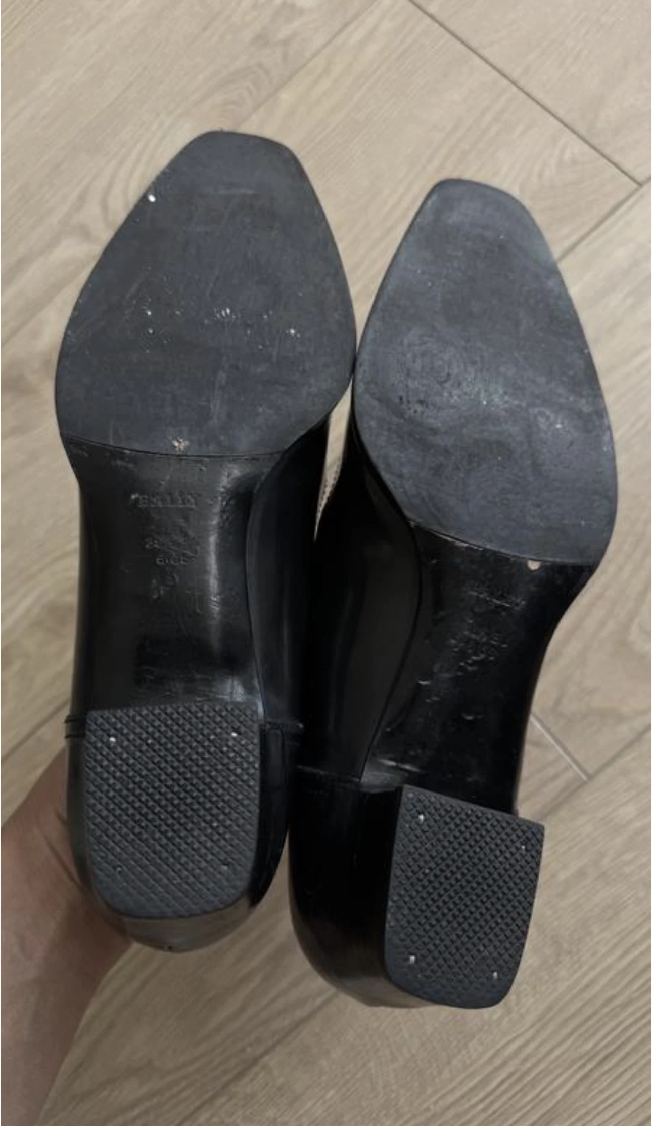 Чорні лаковані шкіряні лофери Bally. Вони мають класичний дизайн з пенні-слотом та, ймовірно, виготовлені з телячої або оленячої шкіри.