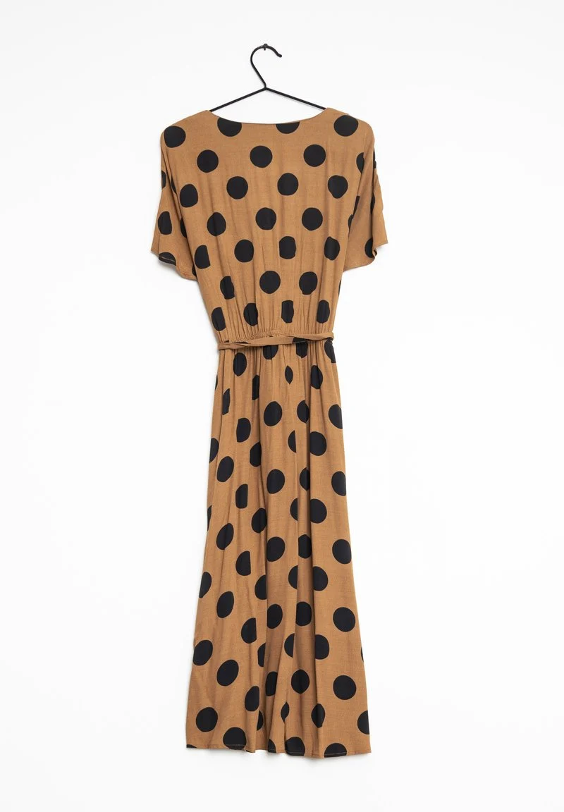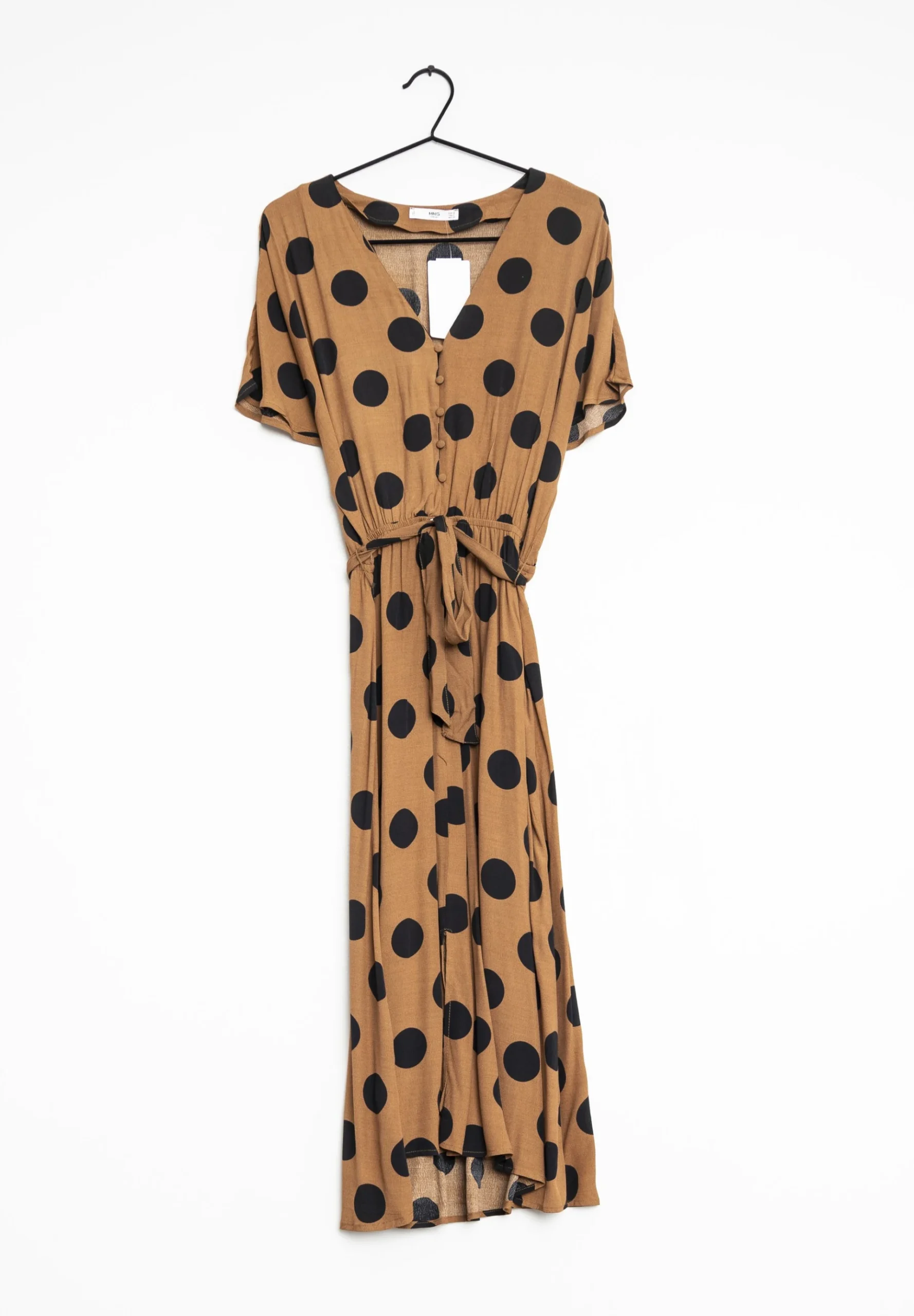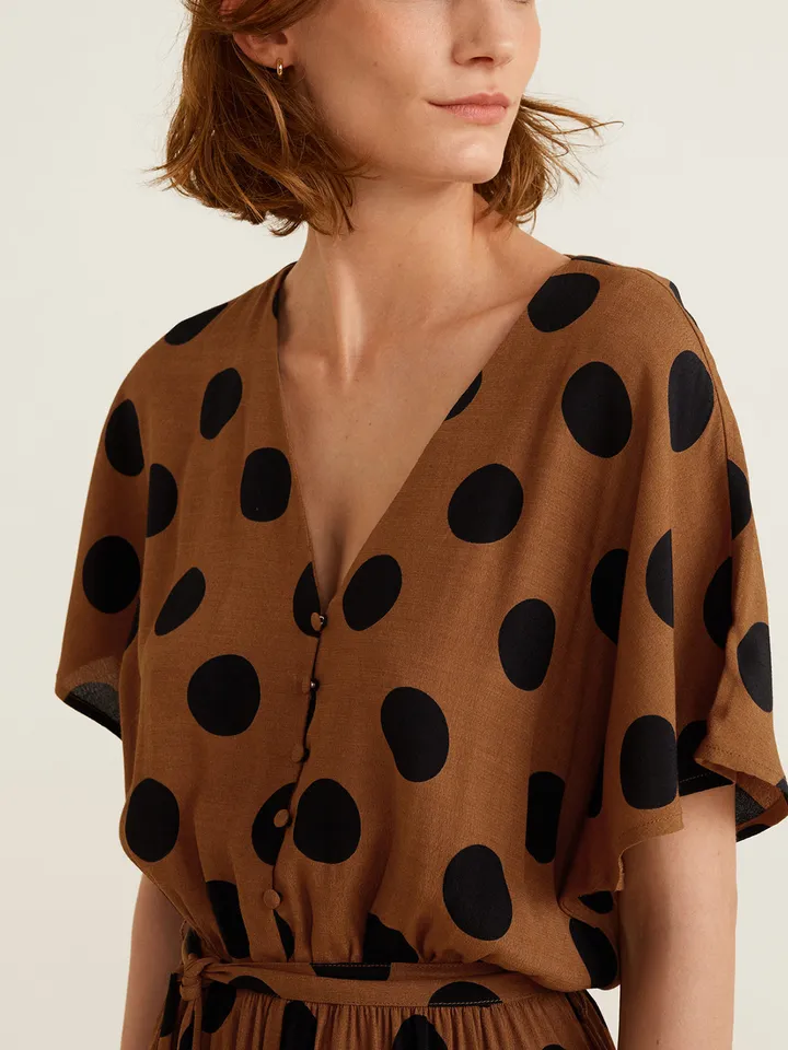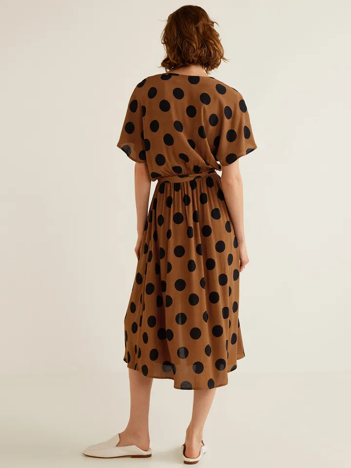 Коричнева сукня в горошок бренду Mango. Вона має V-подібний виріз, короткі рукави та пояс на талії.
